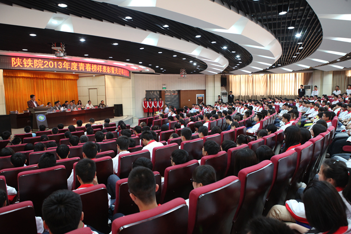 5月7日,学院“2013年度青春榜样表彰暨先进事迹报告会”在临渭校区学术报告厅隆重举行,铁道工程系9名“五类十佳”青春榜样进行了表彰。学生家长、学院领导、老师向“刻苦学习榜样”、“乐于助人榜样”、“甘于奉献榜样”、“自立自强榜样”、“孝老敬亲榜样”学生颁发了证书,披上了绶带。学院党委书记王晖、院长王长友、副院长王闯出席会议。参加会议的还有学工部、学生处、教务处、团委、各系领导,辅导员、班主任、受表彰学生、学生家长代表和各系学生代表共计400余人。表彰会由王闯主持。