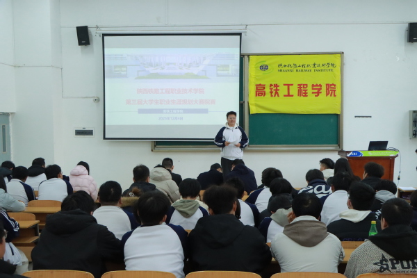 2025年12月4日下午,高铁学院在高新校区GB120举行2025年大学生职业生涯规划大赛院赛。学院党总支书记侯峰、院办主任王飞及学院辅导员担任评委,各班学生代表参与观摩。